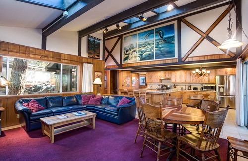 The Legacy is one of the most popular groups of multi-family homes in Yosemite and is perfect for that long-awaited family reunion or summer vacation with a group of friends. Boasting 6 bedrooms and 4 bathrooms, this 3,350 sq. Ft. home sleeps up to 18 guests. The Legacy recently underwent a complete remodel of the kitchen and upstairs bathroom, as well as “unseen” touches, such as all-new plumbing and electrical. The new, fully equipped kitchen has beautiful rustic alder cabinets and granite countertops, a 5 burner, 2 oven range, a large 36” counter depth refrigerator, and a very quiet dishwasher.