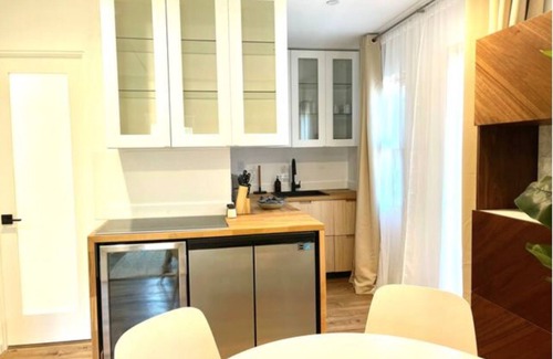 The Living/ Kitchenette/ Dining area has an Eco-induction stove, microwave, an air-fryer/oven, coffee maker, fridge, freezer and wine fridge. Large size Balcony off the kitchenette.