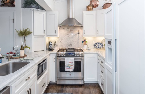 The front door opens into the upper level, which includes an open floor plan with kitchen, dining area and living room, ideal for entertaining. The fully equipped kitchen includes a four-burner gas stove with built-in griddle, built-in water spigot above the stove, stainless steel appliances, and marble counter tops and back splash. Seating for three is available at the kitchen counter.