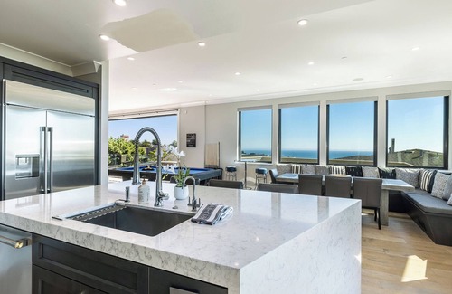 Modern Quartz Countertops with Dramatic Waterfalls adorn this Gourmet Island & Kitchen with the 48" Professional 6-Burner Cooktop and Griddle but don't forget the 2 Ovens for those Family Dinners. The new Weber BBQ is right off the Kitchen Deck for Convenience and has Tremendous Views of Bodega Head and the 3rd Hole. Lastly, enjoy Panoramic Ocean Views & Exotic Sunsets from the Built In Seating and Table Serving up to 10-People.