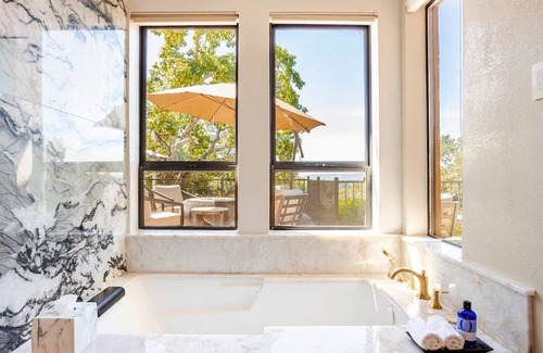 But the main outdoor attraction without a doubt is the 50x18-foot infinity-edge swimming pool with hot tub on the lower terrace along with ample sun loungers adjoining lush green lawns on both sides where guests gravitate on the many sunny days in Sonoma.