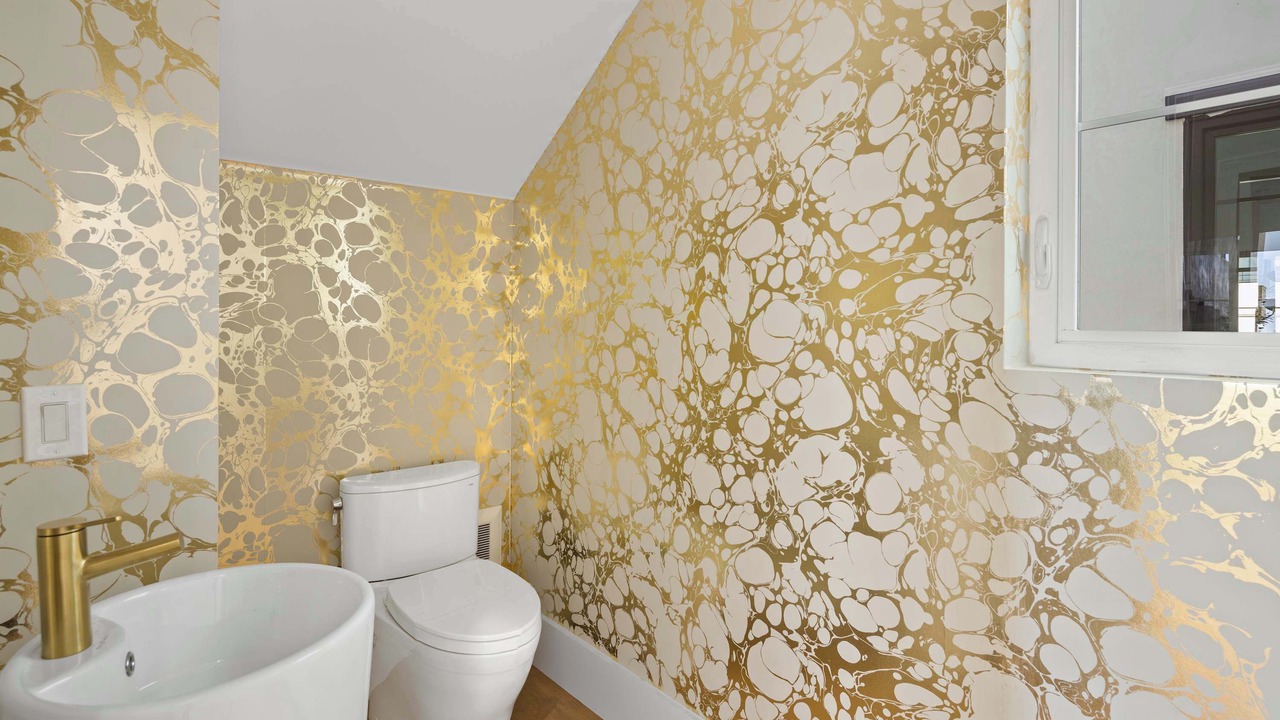 The home also includes a half bathroom as well as an additional full guest bathroom with a single vanity and glass walk-in shower.