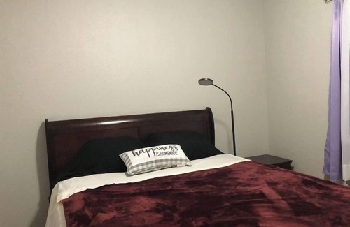 The bedroom has a closet, queen size bed with pillowtop mattress, headboard, footboard, nightstand, portable fan, and small ironing board available. curtains and blinds are provided for privacy. All bedding and towels are provided.