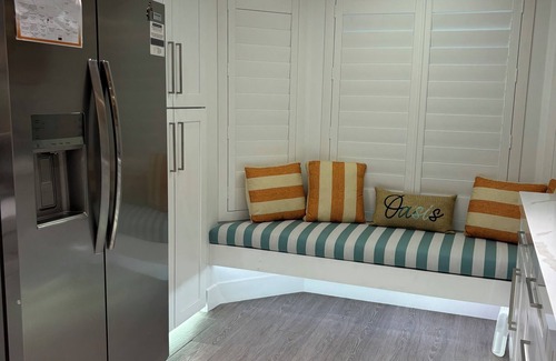 Primary Bedroom has luxurious, Tommy Bahama bedding on memory foam top, Beautyrest Pressure Smart, California king size mattress with designer Boca Raton bedroom set. Mirrored two huge closets. En-suite with new Bluetooth fan/light to sing and relax in spa like shower. Primary Bedroom has 55 "SMART TV-4kUltraHD, IPOD radio and alarm.