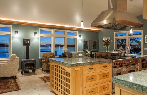 From the moment you step through the ornately designed gateway, with its frosted glass accents, and then pass by the hot tub grotto, sheltered by the fragrant branches of ancient cypress trees, you know you've arrived someplace special. Open the front door and your pulse quickens as the senses are overwhelmed. Vast expanses of glass reveal a timeless panorama of water, the Bay, and beyond, the Pacific. You're aware of flocks of birds, swirling in the trees above you, clustering in the tidal shallows below you. You finally exhale. This is where you dwell. But, what of your immediate surroundings? You shift your glance to the roomy kitchen, all gleaming metal and buffed stone, with its massive marble island, bar stools, and a cozy, built-in window dining area looking out over the water. Your gourmet food fantasies will not take a backseat to the outdoor attractions on this vacation. A charming queen size bedroom shares this upper level of the house, with its own view of the Harbor. A beautiful bathroom adjoins, where an inviting two-person shower awaits. Descending from the kitchen is a travertine limestone staircase that leads to the master bedroom level, with its king size bed and equally arresting water views. Serving the master bedroom area is a large bathtub, with a seamless glass shower set against a private window.