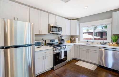 As you enter the home, you'll be greeted by a bright and airy living space. The living room features comfortable seating and a large flat-screen TV, perfect for relaxing after a day of exploring the city. The adjacent dining area provides ample space for meals and gatherings, and the fully equipped kitchen is a chef's dream, complete with modern appliances and all the cookware and utensils you'll need.