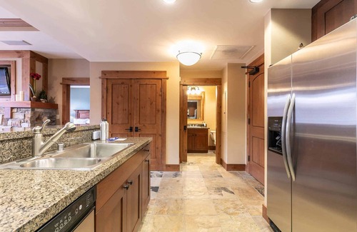 This fabulous, slopeside residence offers a great room with a gas fireplace and flatscreen TV, a chef’s kitchen with premium stainless steel appliances and granite countertops, plus a dining table for six. Additional features include two guest suites, each with a luxurious, attached bathroom and flatscreen TV (primary has a king size bed and soaking tub, secondary can be utilized as a suite and has a kitchenette with a two-burner stove, mini-fridge, microwave and toaster oven), a washer/dryer closet, and underground parking for one vehicle.