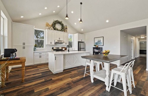 Accommodations: Charming Acres Farmhouse comfortably sleeps up to 5 guests, with three beautifully appointed bedrooms and two full bathrooms. The spacious master bedroom features a cozy king-sized bed, an en-suite bathroom, and ample closet space. The second bedroom offers a comfortable queen-sized bed, while the third bedroom is equipped with a twin bed, ideal for children or solo travelers.