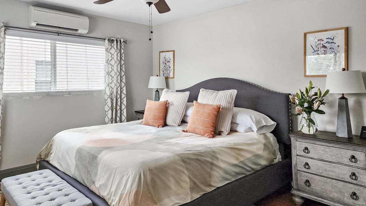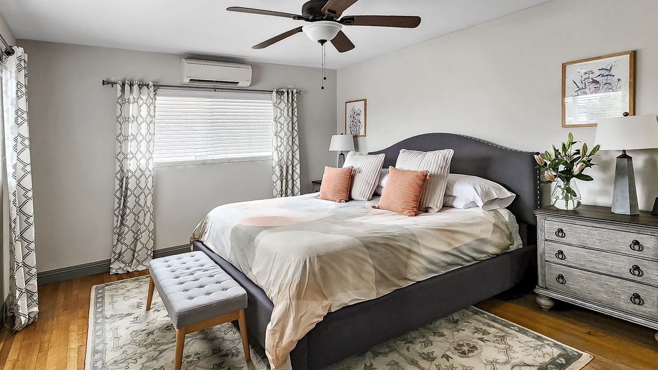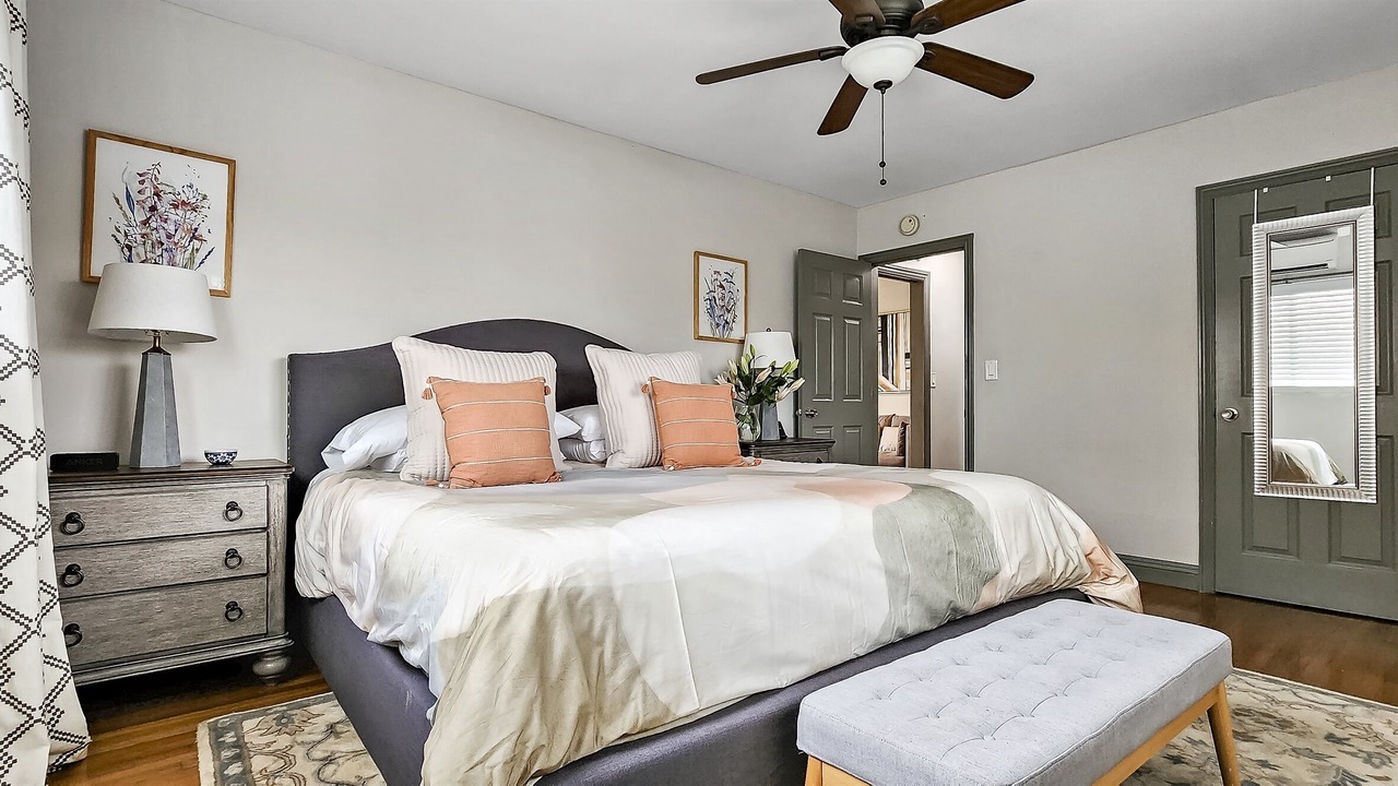 The bedroom offers a large king-sized bed with fresh, hotel-quality linens for a restful night's sleep. With an area rug and a stool for seating, you'll find comfort and convenience in every corner. The full bathroom features a combination shower/tub with glass doors, and we've thoughtfully provided fresh towels, washcloths, and other essentials.