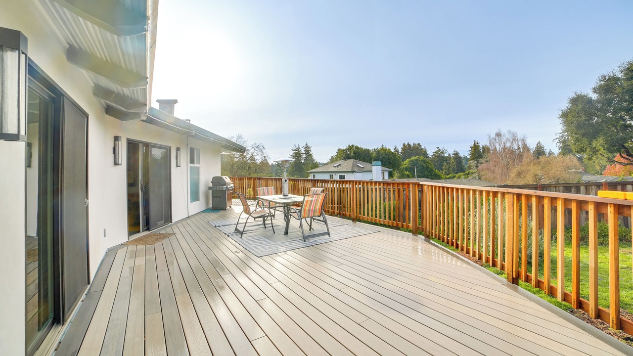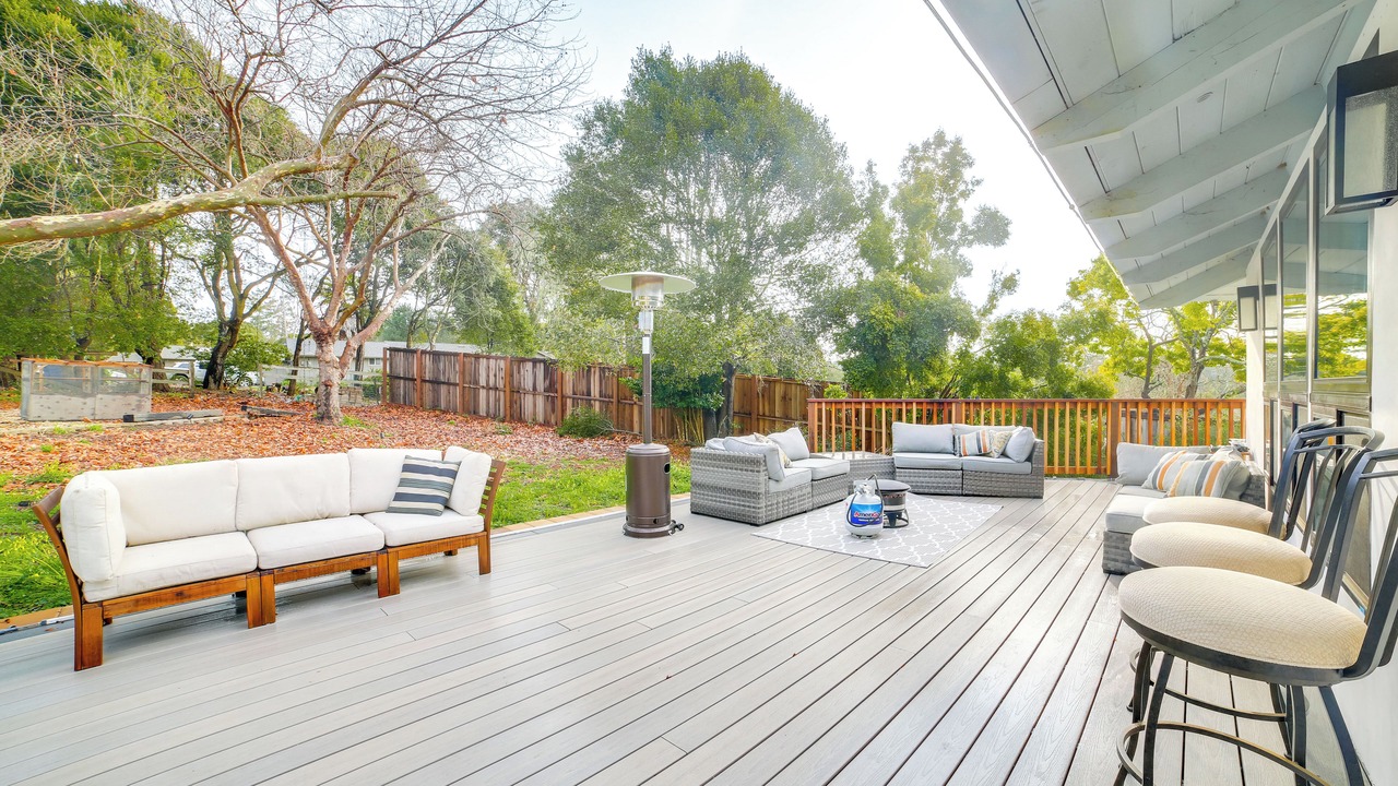 - Modern 1,700-sq-ft wraparound deck w/ seating, dining, heating & gas fire pit