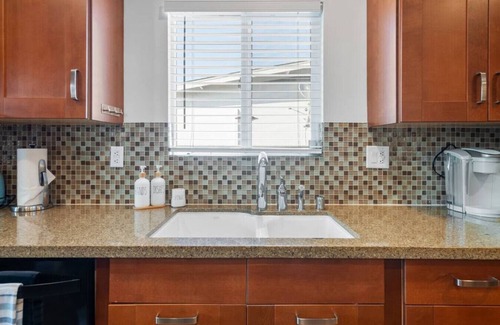 This newly renovated coastal-themed pool house near Long Beach Airport offers spacious bedrooms, including a master with dual vanities and a soaking tub for two. The waterfall shower features natural stone finishes. Enjoy the sparkling lagoon pool with multiple lounges—ideal for family gatherings or friend reunions. The home is eco-friendly with Tesla-powered solar panels and plenty of parking, including a large driveway and street spots. Perfect for relaxation and convenience!