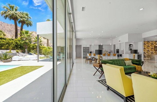 You'll hardly know you've stepped inside the open concept interior, with its vaulted ceilings and moveable walls of glass. The living, dining and kitchen all look out to the pool and mountains. The chef's kitchen has high end appliances, a large center island with seating for 6, and is fully stocked with place settings, cooking utensils, and glassware. Seating for 5 at the kitchen table. Wet bar with sink and wine fridge. The great room has a wonderfully designed seating area with a showpiece piano. The Versace inspired dining room with seating for 12 is something to write home about.