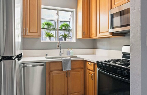 Charming and full of character, this updated Spanish-style home in Pacific Beach is the perfect getaway just a short walk from the beach and bay. The front patio features a BBQ and a dining table with an umbrella, comfortably seating up to six, making it ideal for outdoor meals. In the back, enjoy cozy evenings under the stars around the fire-pit. Inside, the living room invites you to relax with its ambient wood-burning fireplace, large couch, and a TV for entertainment, along with a small desk area for those who need to work remotely. The fully equipped kitchen, complete with stainless steel appliances, is perfect for preparing your favorite meals, and the adjacent dining room seats six for enjoyable meals with friends or family. With three onsite parking spots, partial air conditioning, high-speed WIFI, and an in-unit washer and dryer, this home provides all the modern conveniences. The property is also pet-friendly, welcoming your furry companions to join the vacation. Whether you’re here to soak up the sun at the beach, explore the nearby bay, or simply relax in a serene setting, this bungalow is the perfect retreat for your Pacific Beach getaway.