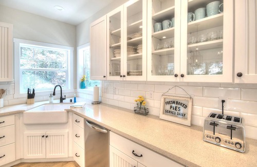 In addition to the gorgeous appeal, this home was designed to make your stay as comfortable as possible including convenient parking and access. The home is a rare single-story property that can accommodate guests of all ages. There are about 10 steps from the parking area, leading down to the entrance. Both restrooms offer double sinks and separate toilet and shower areas. There is satellite base wifi and air conditioning as well. The master suite features a king-size bed, while the middle bedroom has two sets of twin-over-twin bunk beds, as well as a High Definition TV in case the children would like to have their own space to play video games or watch a movie. Satellite WiFi is available for free but is not fast enough for streaming and video calling. The front bedroom has a queen bed decorated with vintage decor, while the living room features a vaulted cottage-style plank ceiling, river rock fireplace, and a 60" 4K TV, complete with Blu-Ray player and satellite cable. The distressed dining table allows comfortable seating for 8 people. The fully stocked kitchen boasts a stylish farmhouse sink, quartz countertops, stainless steel appliances, and beadboard cabinets. Additionally, there is a dining table on the rear deck if you prefer to dine al fresco or simply wish to enjoy the mountain air and forest view. There is a gas BBQ if you would like to grill. The covered front porch features two very comfortable rocking chairs, perfect for sipping your morning coffee or tea.