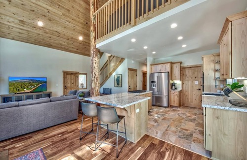 This stunning hilltop retreat was crafted with dramatic timber accents, soaring vaulted ceilings, stacked stone finishes, and expansive picturesque windows that frame forested mountain views. Inside, vibrant Tahoe artwork and upscale furnishings create a warm yet refined atmosphere. The chef’s kitchen features feldspar granite countertops, high-end appliances, and an open pantry—perfect for entertaining.