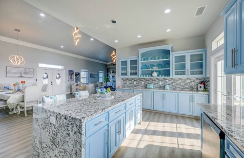 - Island w/ bar seating, dishware & flatware, cooking basics