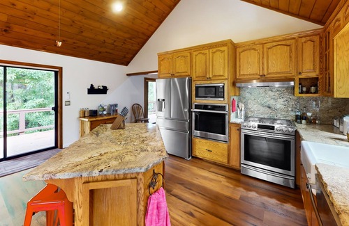 Living room relaxation comes easy with plush leather seating, a smart TV, and a wood stove. The gorgeous full kitchen boasts an impressive suite of updated stainless steel appliances including a gas stove and an electric wall oven, an eat-in dining area, and a smart TV for added entertainment. You'll also find all the cookware and utensils needed to make home cooking a breeze!