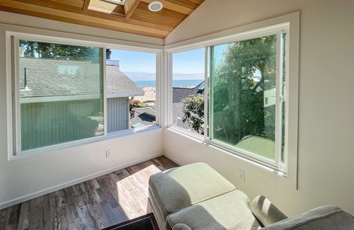 Each day begins in the sunroom upstairs - a bright and breezy space where you can open the windows, relax with your morning coffee, and take in a lovely view of the ocean and neighborhood. Downstairs, the living area is full of sunlight, from the well-equipped kitchen and dining room to the living room overlooking Seabright Avenue. In the evenings, leave your swimsuits to spin in the laundry room, catch up on email over the complimentary WiFi, and curl up to stream movies on the living room's smart TV. Both bedrooms are upstairs, one of which is a beautiful primary suite with its own TV and bathroom.