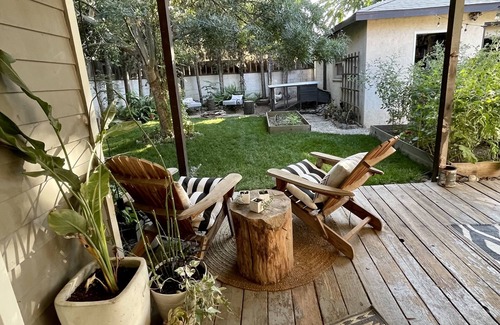 This is a cute Mid-Century home. With a great private backyard equipped with a bbq and fire pit. perfect place to just relax in the evening or enjoy your morning coffee. When the weather is nice outside take dinner outdoors to the large outdoor dining area. Or belly up to a custom built living edge bar top and enjoy a nightcap under the twinkle lights. We offer a adorable kitchen with a large farmhouse sink and quartz countertops. It has all the things you’d need to prepare any meal. The Bathroom includes shampoo, conditioner and body wash. The bedrooms on the upper level are furnished with tvs ready to stream, just log into your favorite provider Netflix, Hulu, HBO, etc… there is a on premise laundry provided we provide hypoallergenic detergent that is free of dyes and fragrance for those sensitive to them. We have chickens! Enjoy fresh eggs when the gals are laying. We also compost, so go ahead and throw what ever organic refuse you’d like into the compost pile.