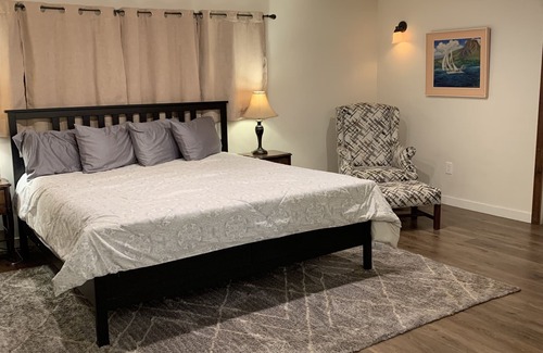 Designed for comfort and relaxation, this cozy studio features a plush king bed, a fully equipped kitchen for your culinary needs, and a bathroom with shower. Step outside to a sparkling swimming pool, picnic tables, and a beautifully landscaped outdoor haven on our safely gated 2½-acre property. On a warm day, refresh yourself in the Oasis, a shaded seating area beneath stately palm trees, refreshed by cooling ocean breezes on warm days. As evening falls, gather around the intimate fire pit to enjoy the starry nights.