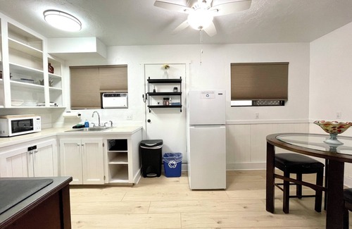 Kitchenette with microwave, fridge & sink & bathroom stocked with amenities. (No stove or cooktop)
