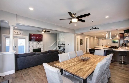 Step into history in this 2,100-sqft gem on the National Register of Historic Places! Once a 1930s restaurant, now a stylish and spacious retreat. Features 4 bedrooms, 3.5 baths, 7 beds, and a comfy couch that doubles as a bed. The large kitchen and dining space are perfect for family meals and celebrations. Ideal for group getaways, work trips, or special occasions. Centrally located and full of charm!