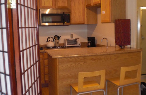 The studio offers a fully equipped open kitchen with dining counter, with dishes/cookware, countertop stove, microwave, toaster oven. Living room has a convertible double bed and built-in closet with linen, towels. Also the French doors lead to a lovely bamboo-lined garden with seating and BBQ.