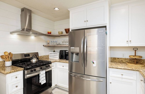 - Fully equipped kitchen with stainless steel appliances + gas range