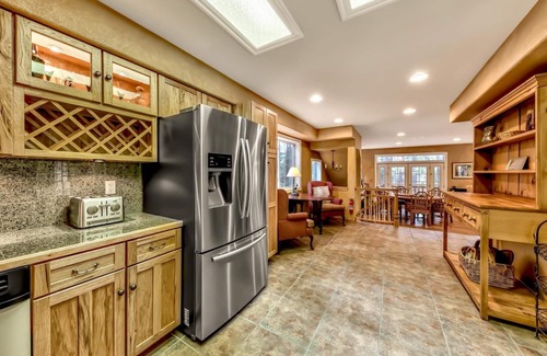 The living room at Heavenly Mountain Gem is a great space for the family to gather. The large windows surrounding the living area let in incredible natural light. Cozy up by the gas fireplace, watch a movie on the HDTV, or play a game at the dining table all while enjoying the company of friends and family. Dining area is open to the living room and seats 6.