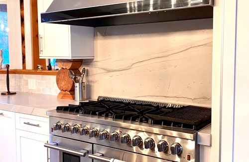 Back inside, a newly remodeled gourmet kitchen, with beautiful natural Brasilian Quartzite stone countertops, new appliances and new woodplank flooring provides all the essentials and more for cooking up a feast for a crowd. There's a professional-grade gas range, a built in refrigerator, built in "drawer" style microwave, dishwasher, and plenty of counter space for prepping. Serve up snacks or casual meals at the kitchen counter with bar stool seating, or drinks at the wet bar next to the kitchen.