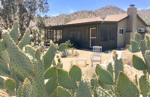 Joshua Tree Dream Weaver is a stylish remodel of 1954 homesteader cabin, perfectly situated on 5 private acres in the Joshua Tree Highlands. Conveniently located an easy 8 minute drive from Joshua Tree Village and 8 minutes to the National Park entrance. All the creature comforts are available while you're right in the heart of the high desert. Take in the properties sweeping panoramic views. The neighborhood, known as the Joshua Tree Highlands is a natural habitat for wild life. You'll see rabbits, birds and other wild life right outside the windows. Relax and star gaze in the 6 person capacity Jacuzzi, and then cool off under the outdoor shower. The fully equipped and stocked kitchen allows you to cook and bake and then enjoy your meals dining inside, or on the screened porch, or outside at the picnic table or deck bistro table. There's an outdoor grill available as well. Barn doors separate the Master bedroom with ensuite bath from the rest of the house. There's a second bathroom next to the a cozy back bedroom. Sliders lead from both bedrooms to the back deck and Jacuzzi. An open floor plan with kitchen, indoor dinging and living/conversation area lead out to a wonderful screened porch.