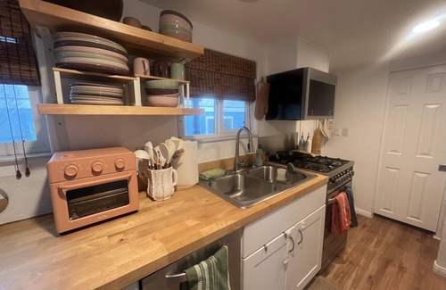 Tiny house with 3 bedrooms and two spacious outdoor decks located 1.5 blocks from Grandview Beach, west of the 101 in Leucadia, Encinitas. Walking distance to two beaches (which are both also famous surfbreaks), restaurants, coffee shops, a brewery, winery, market, shopping, and more! Excellent wifi + a dedicated workstation makes for a perfect remote work location. Fully stocked kitchen, bathroom, and bedrooms with A/C, brand-new, high-quality furniture + amenities, surfboards + beach chairs.
