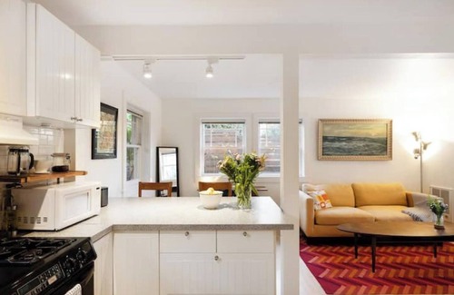Quiet 1 bedroom home on a great street 3 blocks from the South Berkeley Farmer's Market. Thoughtful layout with great flow, tall ceilings, beautiful outdoor space, fully stocked kitchen, laundry and peloton. The space was designed by an architect as her own home. Enter through a garden walkway, and open the french doors in the bedroom to a private back patio. Enjoy hummingbirds, blueberries and figs in the shared yard. Two desks/workspaces and fiber internet. Frosted glass french doors were installed to separate the large bedroom from the common areas (the pictures are from before those were built).