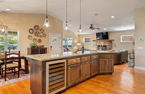 Family room has a gorgeous stone gas start fireplace. High speed WiFi, Smart TV with Roku only, access to Netflix and Hulu, via your own account sign in. There us a circular sofa just made for relaxing! There is recessed lighting with dimmers, and ceiling fans in every room,. Central A/C, decks, patios, comfort galore!