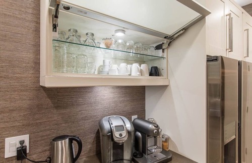 Designed to meet the needs of any group, each floor has a Wi-Fi enabled speaker system [SONOS], recessed lights on dimmers, and a private bathroom for a top quality, stress-relieving “hotel” feel that still has the warmth and intimacy of a home. Perfect for entertaining guests or housing any sized family, the upstairs kitchen boasts modern-chic convenience with all stainless steel appliances, 5-burner Viking stove, automated coffee maker, fully stocked Nespresso espresso maker.