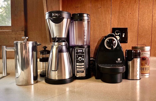 The kitchen is as we call it "small but mighty" ...well equipped with all our favorite tools and appliances. You will find a microwave, blender with food processor attachment, toaster, hand mixer, waffle iron, pots and pans, baking dishes, muffin tins, etc. We love coffee and offer a variety of different coffee makers to brew that perfect cup. (drip, pour-over, french press, espresso, Nespresso, milk frother & bean grinder). We keep the kitchen stocked with basic items such as dish soap, paper towels, spices, cooking oils, coffee filters, etc.