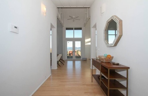 The home is perched on a hillside with 270 degree views and floor to ceiling windows in the common areas decorated in a modern, minimalist style. Multiple outdoor decks including a hot tub make enjoying time outdoors comfortable.