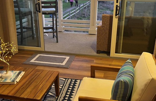 The main living area has a large flat screen TV, fully equipped kitchen with large granite counter and seating for up to 8 guests, and two decks overlooking the panoramic ocean view. From the decks, guests can watch the ever-changing ocean scene, from dolphins, whales and pelicans, to surfers, kayakers and stand-up paddle boarders. The backyard area is a dedicated wetland restoration area planted with California native plants.