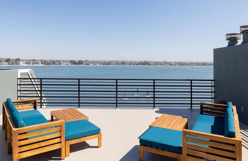 Beach Haven is a bayfront, stand-alone home with four bedrooms, four bathrooms, and a rooftop deck. This home is located directly on the sands of Sail Bay, where the ocean expands into a huge, calm, lake-like Bay to enjoy all watersports and undisturbed swimming. The crashing waves of the Pacific Ocean and unforgettable sunsets await just a few hundred feet across the street. Light, bright and airy, this newly remodeled home offers water views from every room. The huge roof deck affords a 365-degree all-around view from the third floor. From one of the two primary bedrooms, the second-floor primary bedroom steps out onto a waterfront view deck, which covers the full width of the home. You will find all rooms extraordinarily spacious and the home and kitchen equipped with all items needed for a perfect vacation.