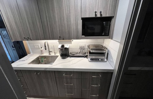 The kitchenette has a Keurig coffee maker, microwave, double hot plate and a toaster oven for cooking.