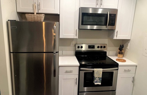 Kitchen is stocked with a drip coffee maker, all the necessary pots, pans, dishes and utensils to cook and serve a basic meal. Comforters, linens, and beach towels are provided.