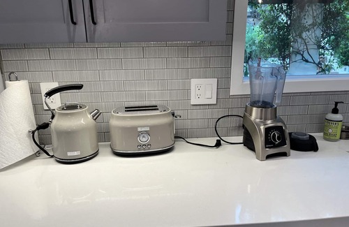 The house has two bedrooms (K, Q) and two full baths with working tubs and showers. The "casita" in the back yard can serve as an extra sleeping nook (shown here with twin bed), office, or yoga/fitness room. The house sleeps 5, and we also provide supplies for babies and toddlers (pack and play, changing table, child’s tent and tables/chairs). Your children or grandchildren are entirely welcome.