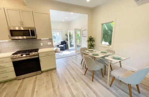 Bright and airy with high ceilings and a private keyless entry, this Spanish-style detached guest house was recently remodeled with amenities that will make you feel right at home.