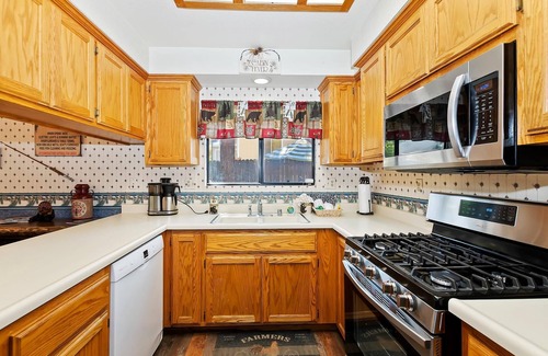 The fully equipped kitchen features stainless steel appliances, a coffee maker, and everything you need to prepare meals during your stay. A bar top separates the kitchen from the dining area, making it easy to serve meals and socialize at the same time.