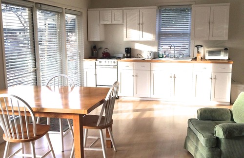 Studio apartment, tucked away on a grand old Beverly Hills Estate, once home to Joseph Kennedy. Just once block south of the Beverly Hills Hotel, smack in the middle of Beverly Hills' most exclusive neighborhood. Perfect for an individual or a couple looking for an elite address within a tranquil setting. When traveling with a child, request an extra bed. Bright, cheerful, but simple. This apartment is functional and comfortable, not luxurious. Full service kitchen. A wall of six French doors look out over a half-acre garden, shaded by tall Eucalyptus trees and lush bougainvillia.