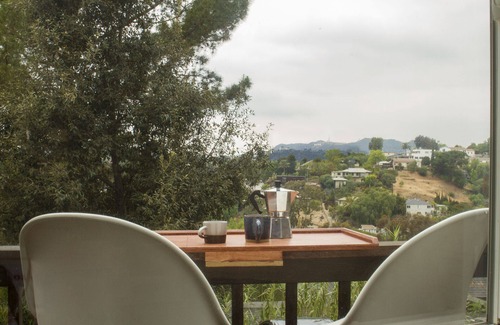 This light-filled oasis perched in the hills of Echo Park possesses beautiful, modern architecture with an open floor plan and a remarkable view all the way to the Hollywood sign and Griffith observatory. The 650 square feet (60 square meters) home comfortably sleeps two, with amazing sunsets lighting up the bedroom. The house has all modern appliances and conveniences (heat/air conditioning, dishwasher, and modern cooktop with 4 gas burners).