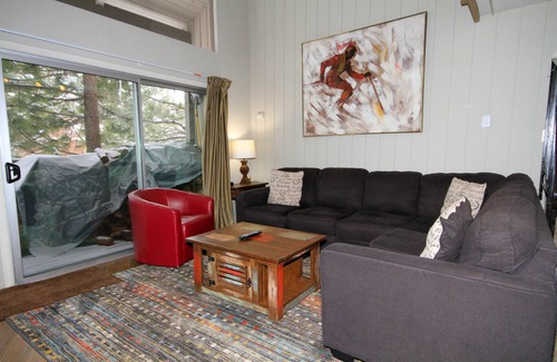 The pine trees just outside the large living room and kitchen windows of this condominium will give you a real mountain cabin experience.