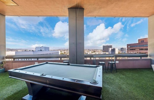 Welcome to our exquisite 2-story, 2-bedroom, 2-bathroom condo that offers a luxurious retreat in the heart of Downtown Los Angeles (DTLA). With a pool table on a spacious balcony boasting breathtaking views of both DTLA and Hollywood, and direct access to the rooftop pool, spa, fire pit, grills, and cabanas, this is the epitome of urban living.