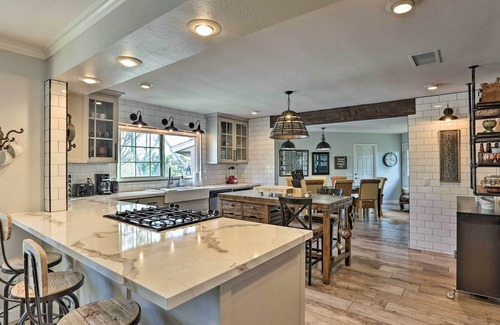 GOURMET KITCHEN: Fully equipped, stainless steel appliances, gas range stove, marble counters, eat-in breakfast bar, high-top kitchen island w/ seating, full knife set, drip coffee maker, spice rack, toaster, blender, cooking basics, dishware & flatware
