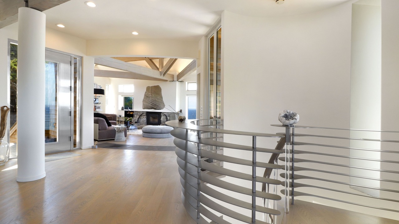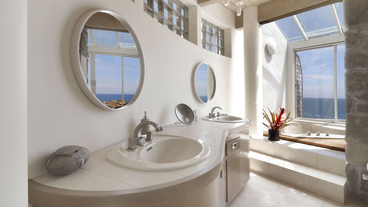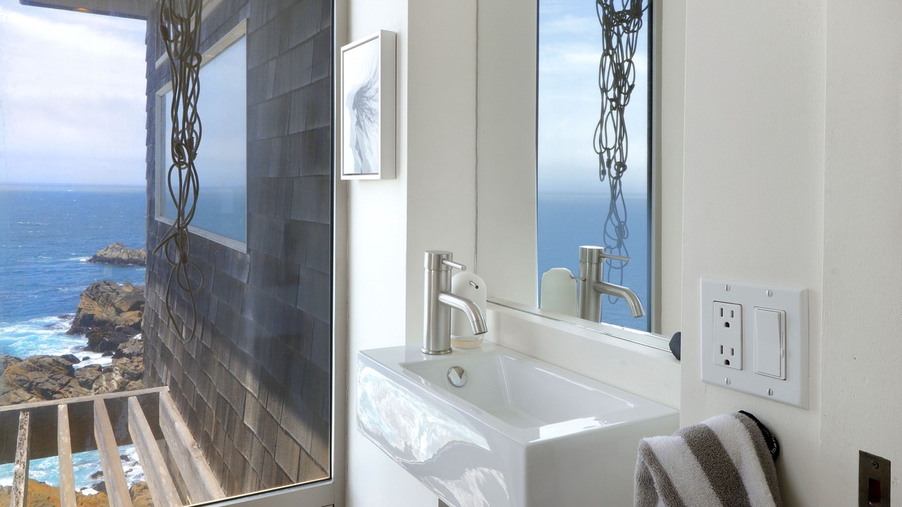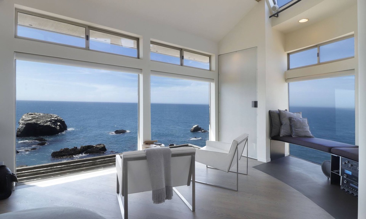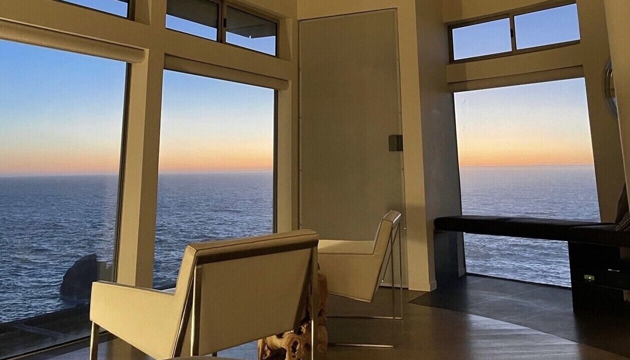 The spa/sun room is one of the favorite rooms in the house. It has a large soaking tub w/ recycling fresh water that stays heated at 103 degrees, sliding doors that open wide to the ocean view, a moon eclipse sconce light over the tub and a rain shower to complete the experience. It’s the perfect place to relax and soak in the beauty of the coast any time of the day or night.